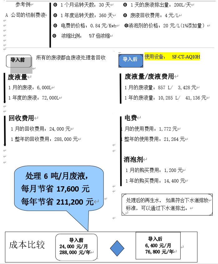 本产品主机设备结构紧凑,占地面积较小,只需用少量的电和消泡剂,可以实现 24 小时 连续的自动运转,减轻作业人员的劳动负荷。 (注:适用于各种水溶性废液)